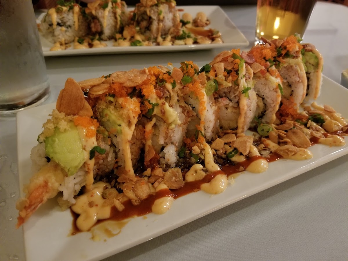 ................................US$18.00Inside: shrimp tempura and imitation crab top: avocado, garlic chips, smelt eggs and green onion sauce: spicy mayo, sriracha and yakidare